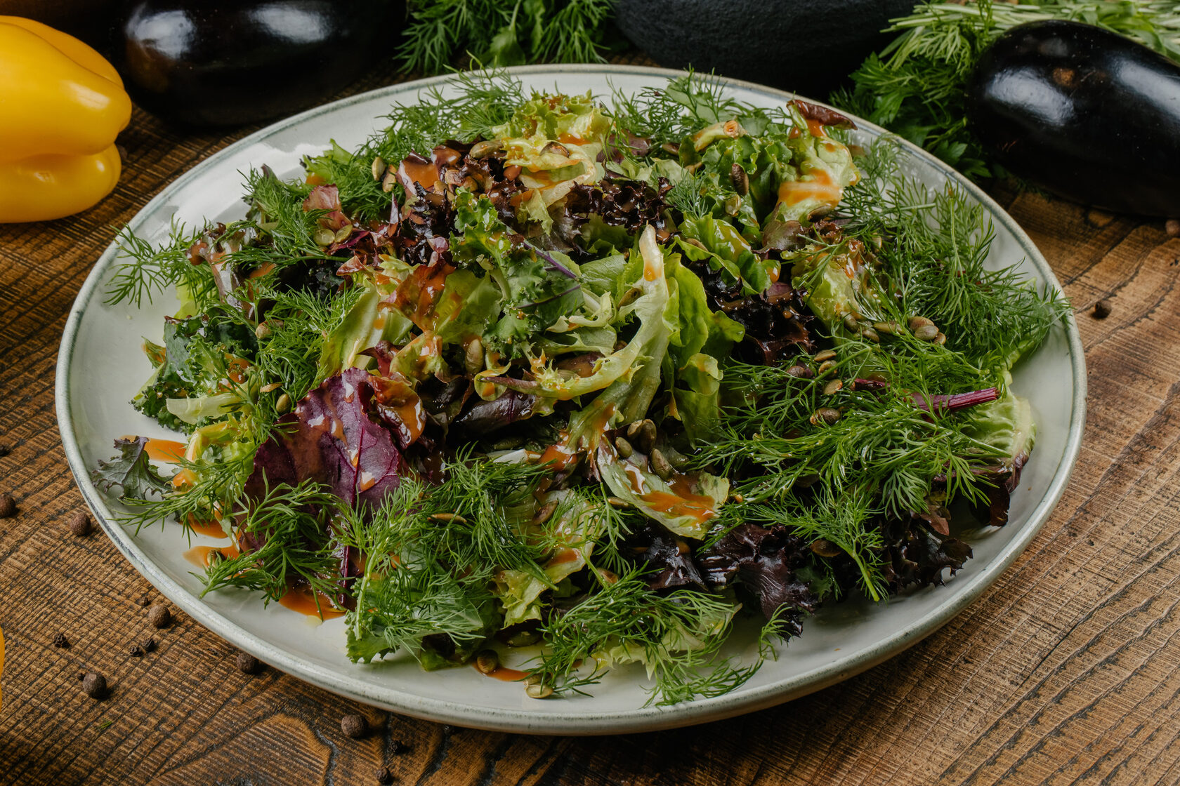 подкопченная говядина собственного производства, микс салата, огурцы, томаты, тыквенные семечки