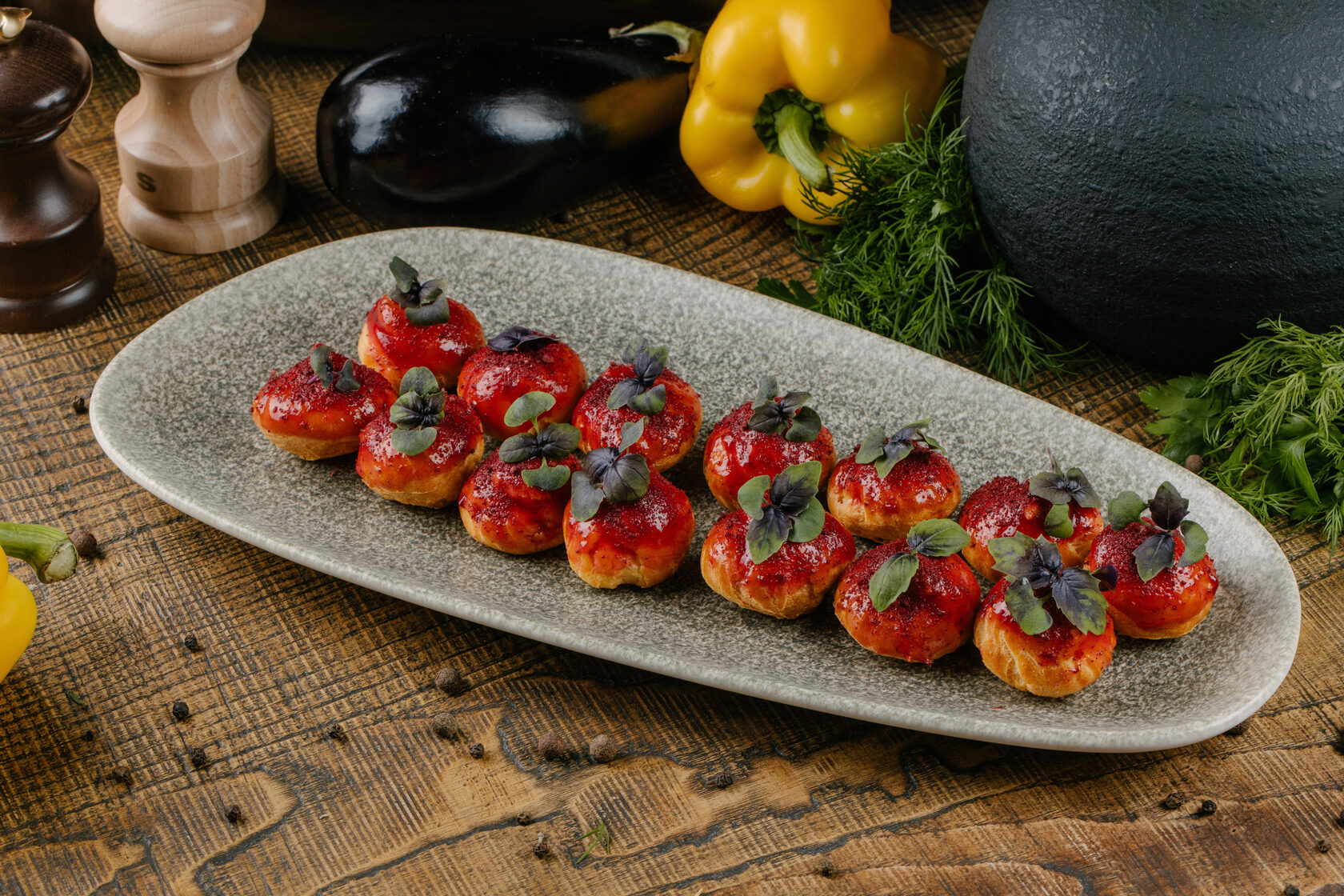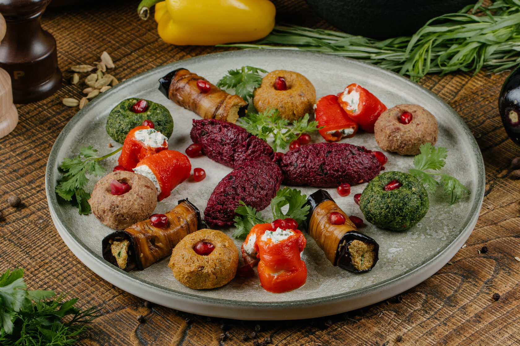 ассорти пхали, бадриджани с ореховой начинки, рулетики из печеного перца с сыром и зеленью