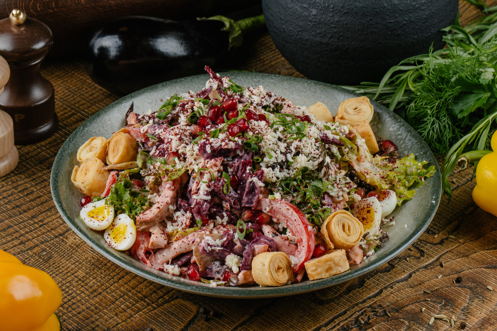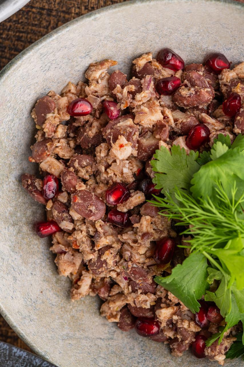 подкопченное куриное филе собственного производства, чипсы из лаваша, томаты, свекла, чеснок, грузинские специи, домашний майонез