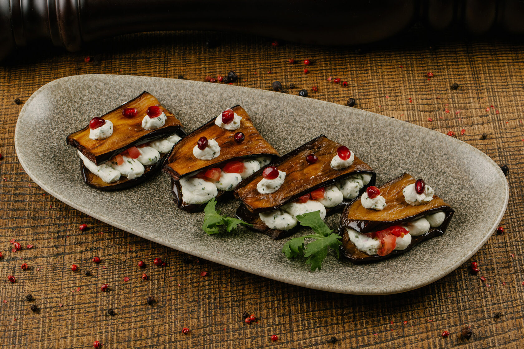 жареные баклажаны с творожно-чесночным сыром и томатами