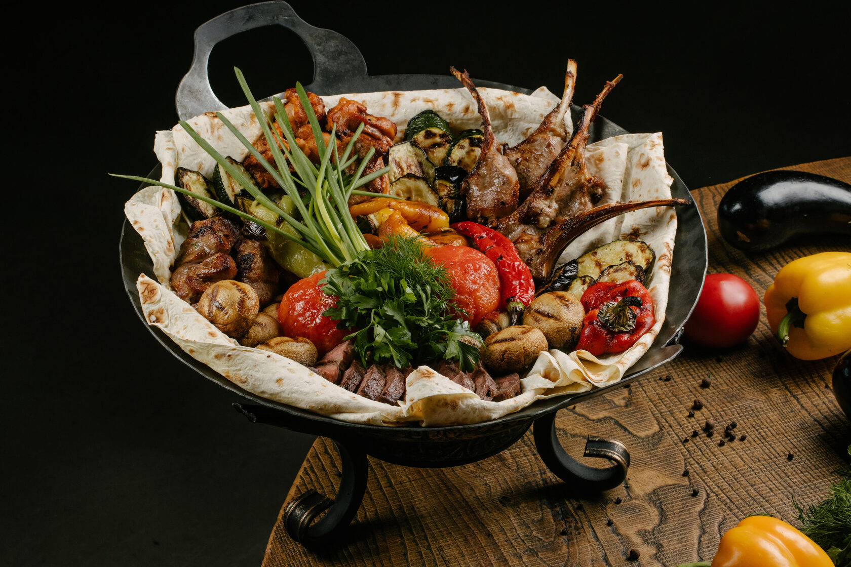 шашлык из свинины, куриного бедра, каре ягненка, стейк блейд, овощи на гриле